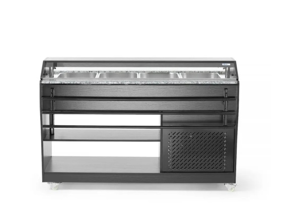 Mieści 4 pojemniki GN 1/1 o głębokości maks. do 150 mm. 4 pojemniki GN 1/1 w zestawie. Konstrukcja wykonana ze stali nierdzewnej z obudową wykonaną z drewnianej sklejki w kolorze czarnym. Wyposażony w oświetlenie. Zadaszenie składane, blokowane zatrzaskami. Składane półki na tace po obu stronach urządzenia. Przestrzeń na naczynia na dole urządzenia. Możliwość regulowania temperatury w zakresie: od 2°C do 10°C. Klasa klimatyczna: 4.