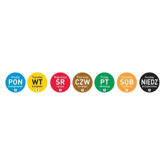 - Każdy dzień tygodnia oznaczony innym kolorem
