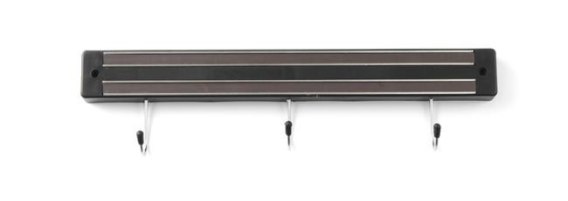 Listwa magnetyczna z haczykami firmy Hendi to praktyczne akcesorium umożliwiające łatwy dotęp do narzędzi kuchennych.
