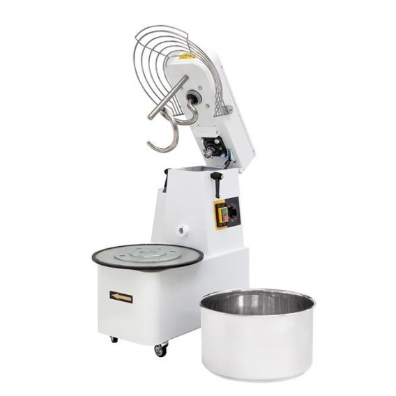 Do użytku profesjonalnego Idealna dla pizzerii, piekarni, cukierni, pierogarni, pączkarni do wyrabiania ciężkich ciast Masywna i wytrzymała obudowa wykonana ze stali lakierowanej na biało Dzieża, osłona bezpieczeństwa, spirala wykonane ze stali nierdzewnej AISI 304 Podnoszona głowica i wyjmowana dzieża – łatwiejsze utrzymanie urządzenia w czystości Kratowana osłona bezpieczeństwa ułatwiająca dodawanie składników podczas pracy Mikrowyłącznik zatrzymuje pracę urządzenia przy otwarciu osłony bezpieczeństwa Napęd łańcuchowy zapewniający wydajną pracę 2-biegowe pokrętło zmiany prędkości mieszania – drugi bieg umożliwia uzyskanie większej hydracji Gwarancja cichej pracy dzięki przekładni olejowej Doskonała jednorodność oraz napowietrzenie ciasta Nie nagrzewa ciasta podczas pracy Wbudowany 30-minutowy timer 4 kółka, w tym 2 z hamulcami, zapewniające wygodny transport i łatwe użytkowanie w kuchni Wymiary dzieży (mm): ⌀450x (H)260