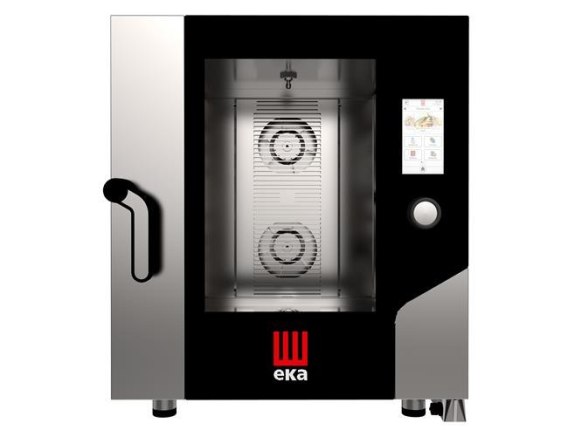 Obudowa i komora wykonane ze stali nierdzewnej AISI 304; komora tłoczona, z zaokrąglonymi narożnikami ułatwiającymi czyszczenie. Drzwi przeszklone, 2-warstwowe, wentylowane grawitacyjnie, zawiasy po prawej stronie, z blokadą przy otwarciu na 60°, 90°, 120°, 180° dla bezpieczeństwa pracy; możliwość zamówienia pieca z zawiasami po przeciwnej stronie. Taca ociekowa na skropliny z odpływem w drzwiach. 2 wentylatory z autorewersem, o 3 prędkościach. Wytwarzanie pary: bezpośredni natrysk, 10-stopniowe (0 – 100%), sterowane elektronicznie. Dotykowy panel sterowania TFT (Thin Film Transistor) – kolorowy ekran dotykowy o rozdzielczości 800x480 mm. Pokrętło z funkcją zatwierdzania i przewijania opcji na ekranie. Wielopunktowa sonda rdzeniowa – 3 punkty pomiaru temperatury. Regulowane nóżki dla idealnego wypoziomowania. Gotowanie/pieczenie w 3 trybach: konwekcyjny, parowy, konwekcyjno-parowy (combi). Możliwość sterowania okapem kondensacyjnym oraz komorą rozrostu z poziomu panelu sterowania pieca. Automatyczny system myjący w 4 programach: eco, normalny, intensywny, płukanie. Dodatkowe funkcje: -Pre-heating: nagrzewanie wstępne komory o +30˚C więcej niż temperatura zadana, -Multilevel: możliwość gotowania różnych potraw w tych samych warunkach, o różnym czasie obróbki termicznej, -Holding Cabinet: utrzymywanie ugotowanych potraw w temperaturze serwowania, -Cool Down: szybkie schładzanie komory dla szybkiej zmiany aktualnie gotowanego produktu, -Proofer: piec pełni funkcję komory rozrostu. Opatentowane systemy Tecnoeka: -Airflowlogic™: przeprojektowany deflektor w celu poprawy cyrkulacji powietrza. -Humilogic™: wtryskiwanie wody zza wentylatora zapewniające wysoki poziom wilgoci przy zmniejszonym użyciu wody. -Drylogic™: szybkie osuszanie komory pieca poprzez szybkie odprowadzanie nadmiaru wilgoci poza komorę. Wyposażony w port USB – do pobierania danych HACCP. Połączenie Wi-Fi do aktualizacji oprogramowania. Programowalny: zapisywanie 500 programów, do 10 kroków w każdym. Możliwość wyboru ulubionych receptur i ustawienia ich jako przepisów szybkiego startu. Menu w 42 językach. Programowanie opóźnionego startu aż o 24h. Zabezpieczenie przed przegrzaniem. Pojemność komory: 7 blach GN 1/1 (nie są dołączone do zestawu). Współczynnik szczelności: IPX 5. Zakres temperatury: 30°C do 270°C. Odległość między prowadnicami: 73 mm.